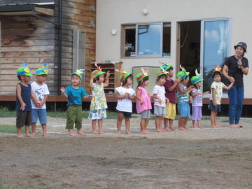 日中の炎天下のため、大好きな盆踊りはなかったけど、大勢のお客さんたちの前で見せ合いをすることができて、子どもたちの心に達成感をもたせることができたのではないかな?と、キラキラ輝いているこどもたちを見て思いました。