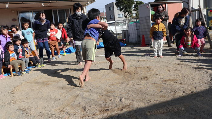 次は 3,4,5歳児の縦割りチーム 「まゆチーム」対「りゅうチーム」の取り組みです。土俵際・土俵際・土俵際・・・に注目ですよ。