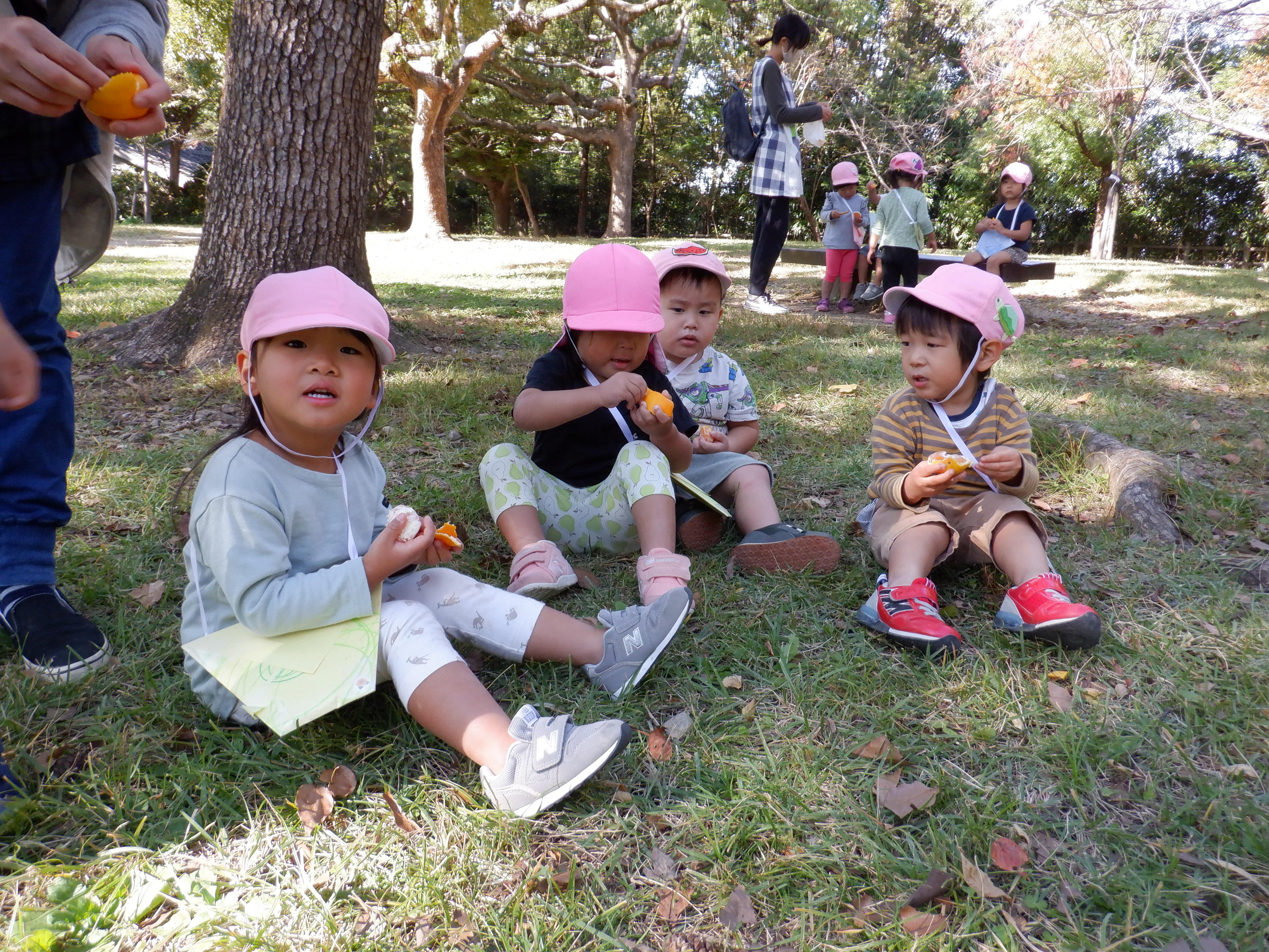 11月初旬、もも組(2歳児クラス)は、遠出の散歩の日。みんなで、浜松城公園に行きました。到着してすぐに、たくさんのカモを眺め、みんな大喜び。