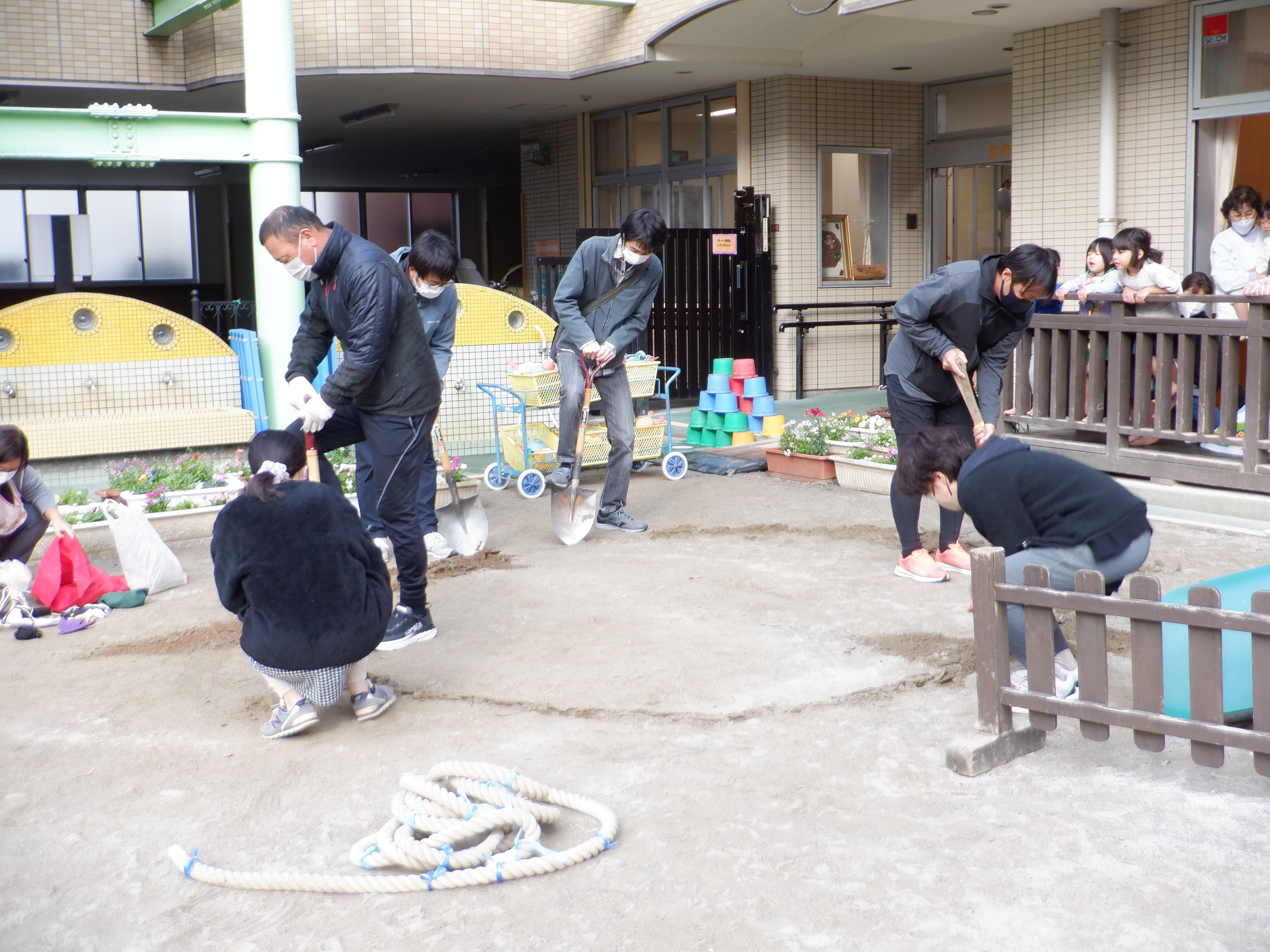 子どもたちが元気に遊ぶ園庭や室内の環境整備に、お父さんお母さんたちが、力をかしてくれました。普段、職員だけではやりきれない、どぶ掃除や、植木の刈り込み、室内のお掃除などなど。お日様が隠れていて、少し冷える日でしたが、協力、ありがとうございました。