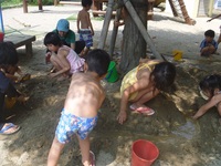 すくすくさん(5歳児)がダムづくり。掘る人、つくる人。水を運ぶ人。みんなの共同作業です。「ねえ、水くんできて~」「トンネルが通ったよ~」「わ~壊れた~」「こっちもつながったよ~」壊れてはつくり、つぎにつなげ・・。みんなで声をかけあい、イメージを共有して楽しんでいました。