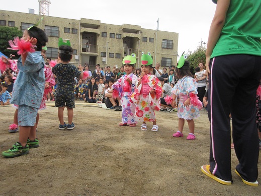 どんどん組(3歳児)はカエル音頭。おたまじゃくしから飼育しているからこそ、カエルになりきっていた子どもたちです。