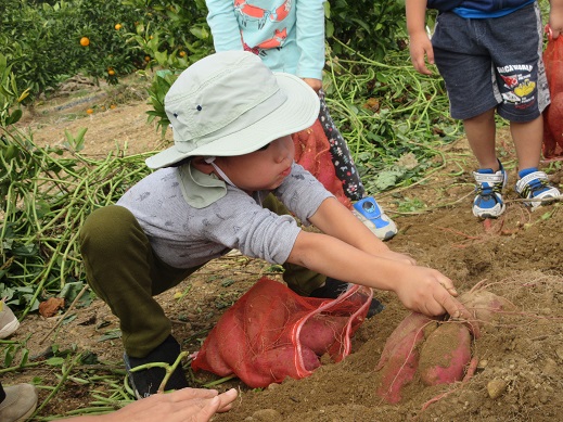 今日はお弁当遠足。細江農民組合の協力を得て3歳児はお芋ほり、4歳児はみかん狩りに出かけました。
