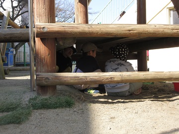 アスレチックの下は、秘密基地のよう。子どもたちは、狭いところが大好き!4歳児ぐんぐん組の男の子たち。楽しそう!