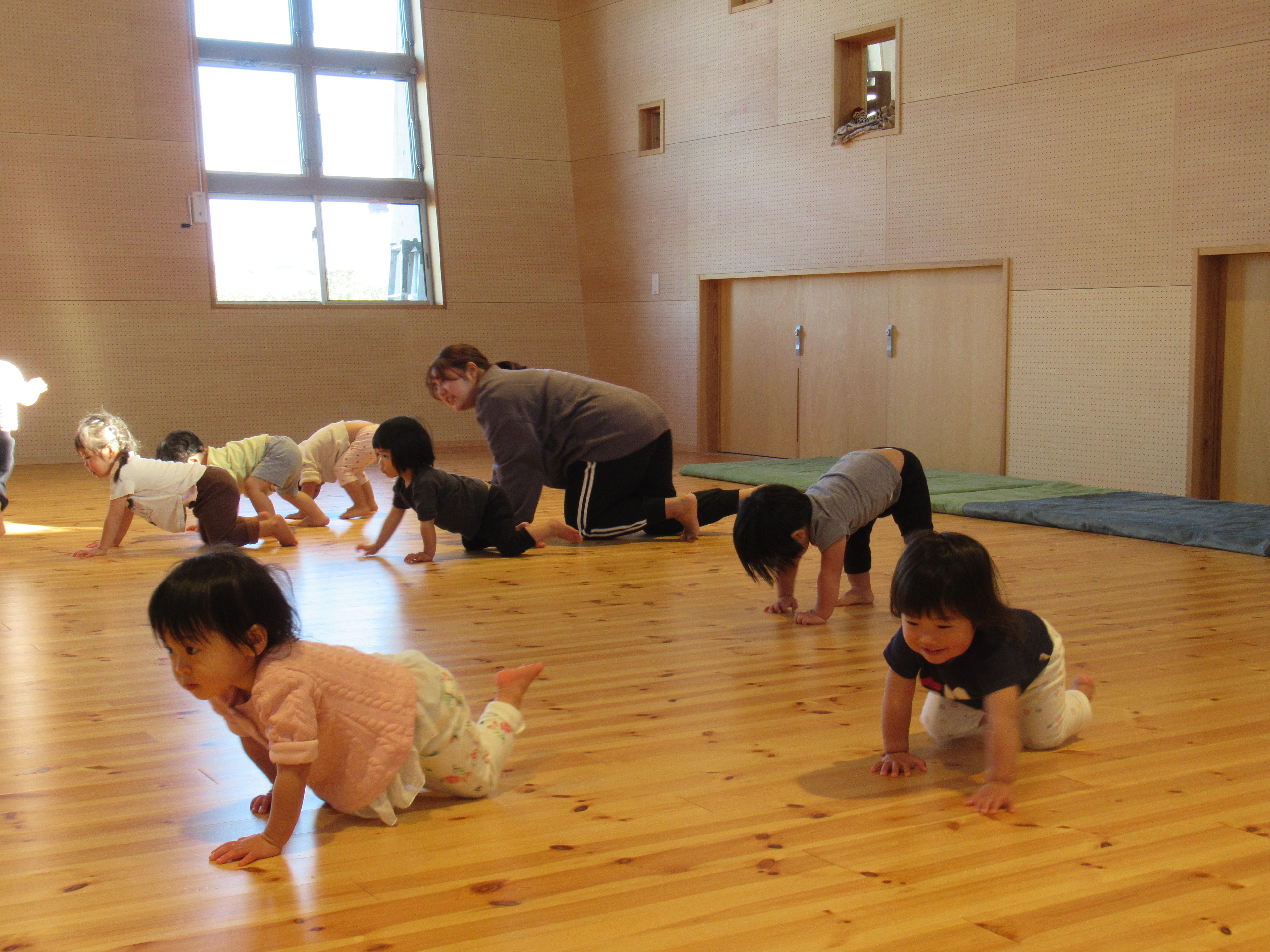 お尻をあげての高這い。腕で身体を支える力を育てます。ちゃんと座れる力の土台にもなります。楽しくやるからこそ力がつくね。