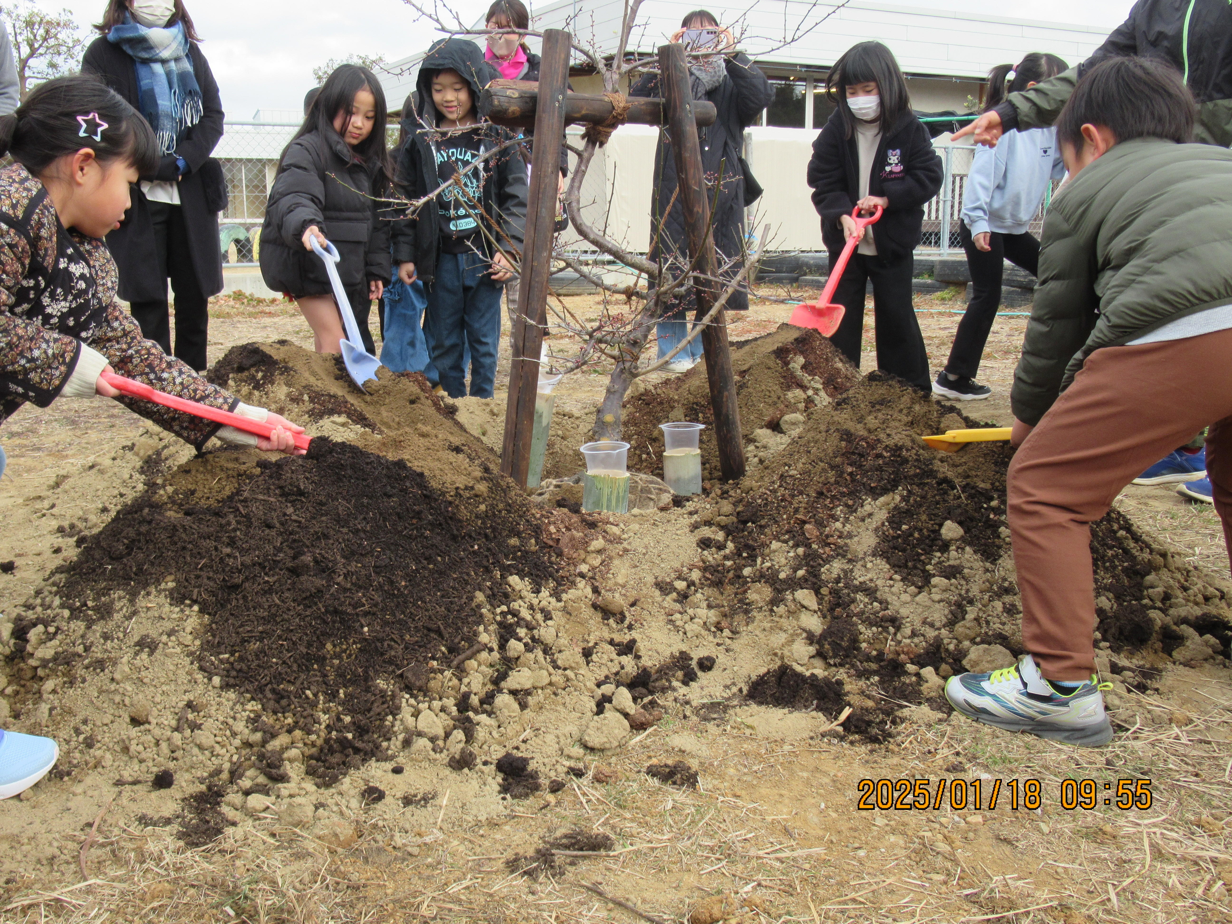 昨年度卒園するときに、卒園児の保護者の方から保育園に「実のなる木を植えてください」という目録をいただきました。1月18日(土)に卒園児(小学1年生)の皆さんが親子で集まってくださり、梅の木を植えてくれました!今年の夏の梅ジュースは、この梅の木から収穫できるとのこと。とても楽しみです!